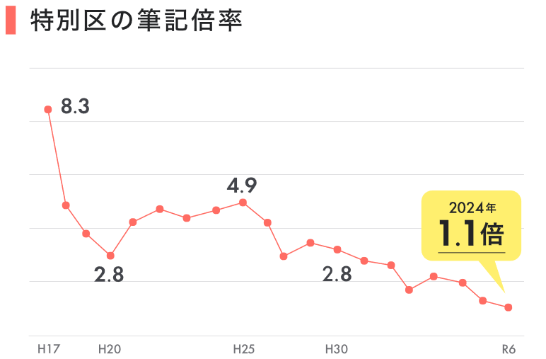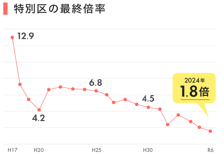 特別区の「筆記倍率」と「最終倍率」は近年減少傾向にあり、令和6年では、筆記倍率は「1.1倍」であり、最終倍率は「1.8倍」となりました。