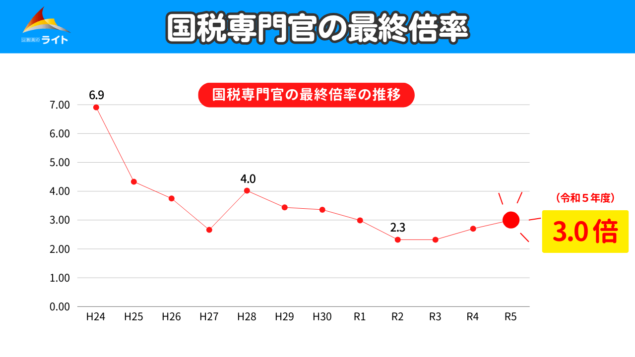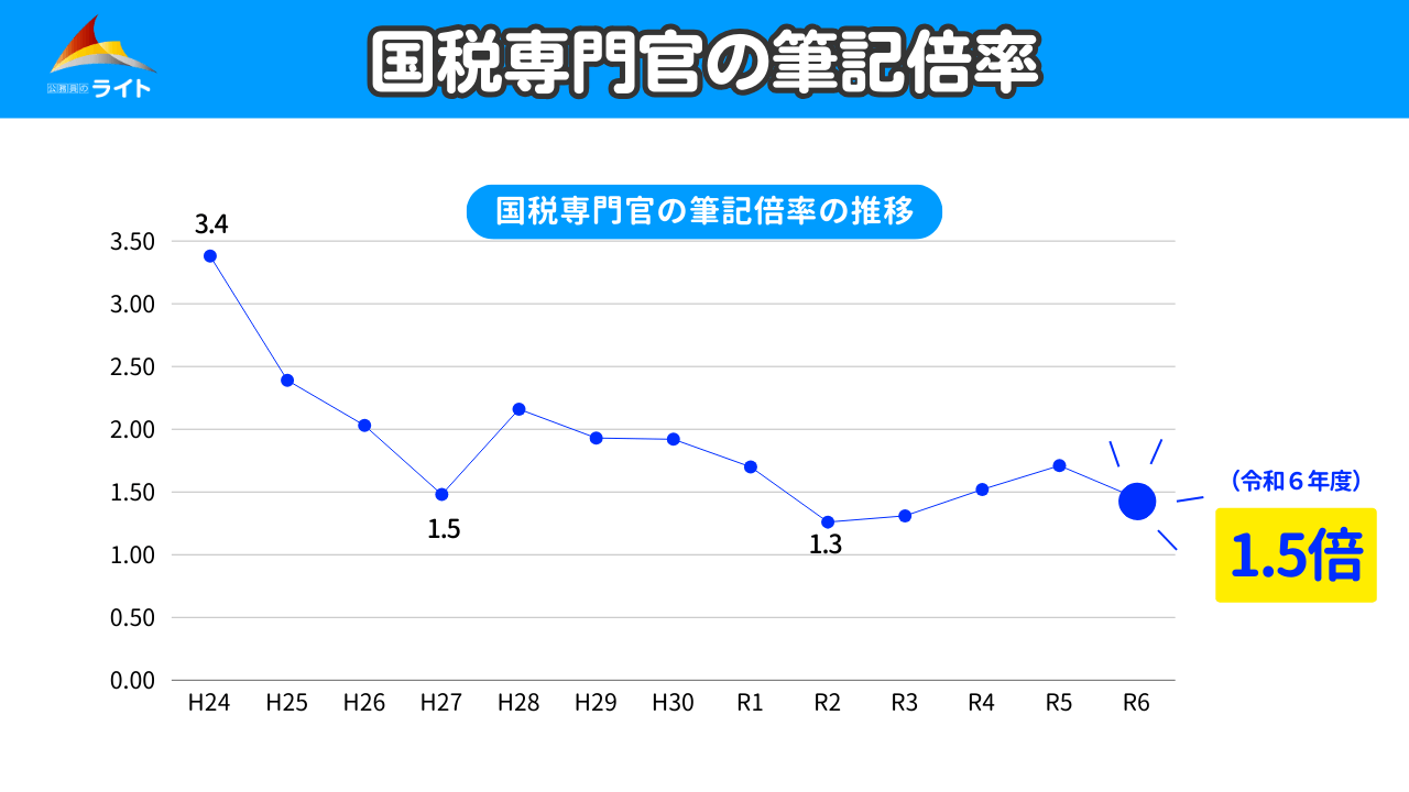 国税専門官の「筆記倍率」と「最終倍率」は近年減少傾向にあり、令和6年の筆記倍率は「1.5倍」であり、令和5年の最終倍率は「3.0倍」となりました。