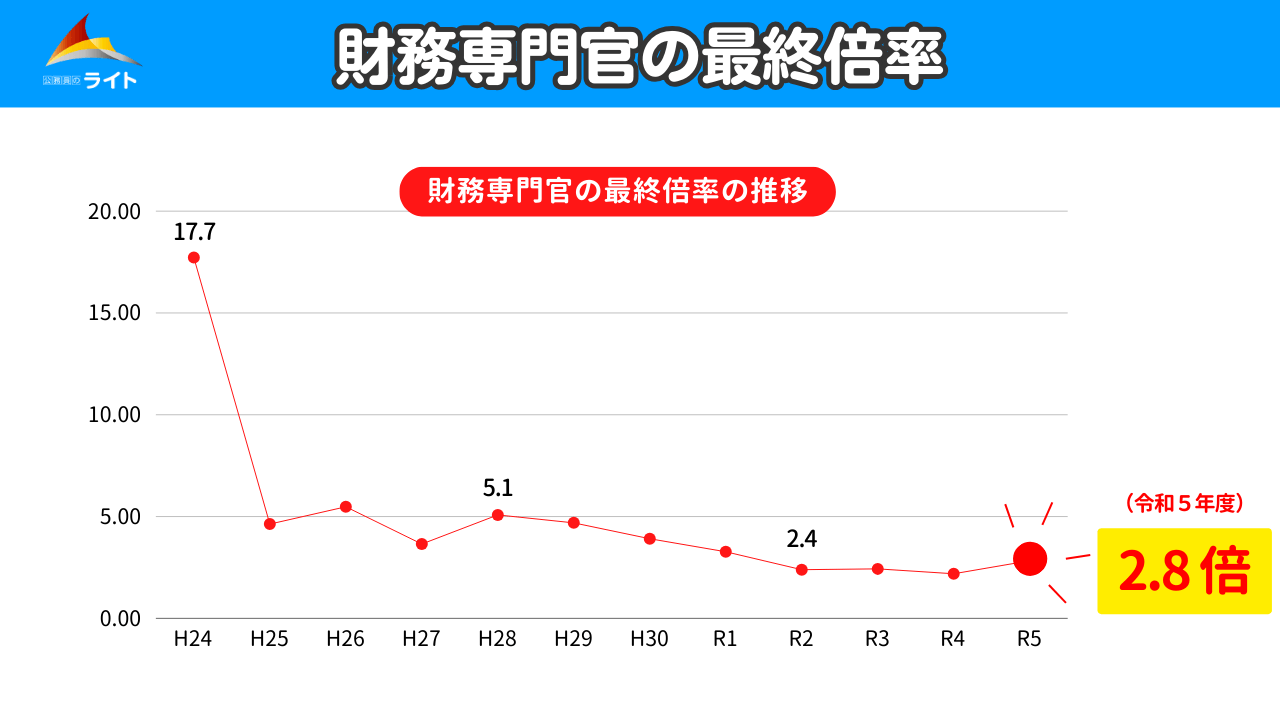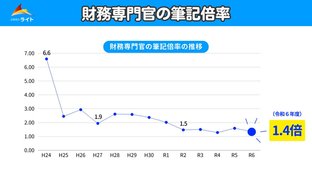 財務専門官の「筆記倍率」と「最終倍率」は近年減少傾向にあり、令和6年の筆記倍率は「1.4倍」であり、令和5年の最終倍率は「2.8倍」となりました。