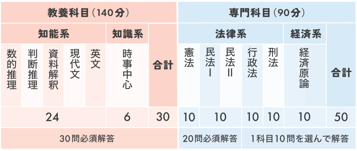 裁判所事務官の教養科目は試験時間が140分で、必須解答が30問です。また、専門試験は試験時間が90分で、必須解答20問と、1科目10問を選んで合計30問解答します。