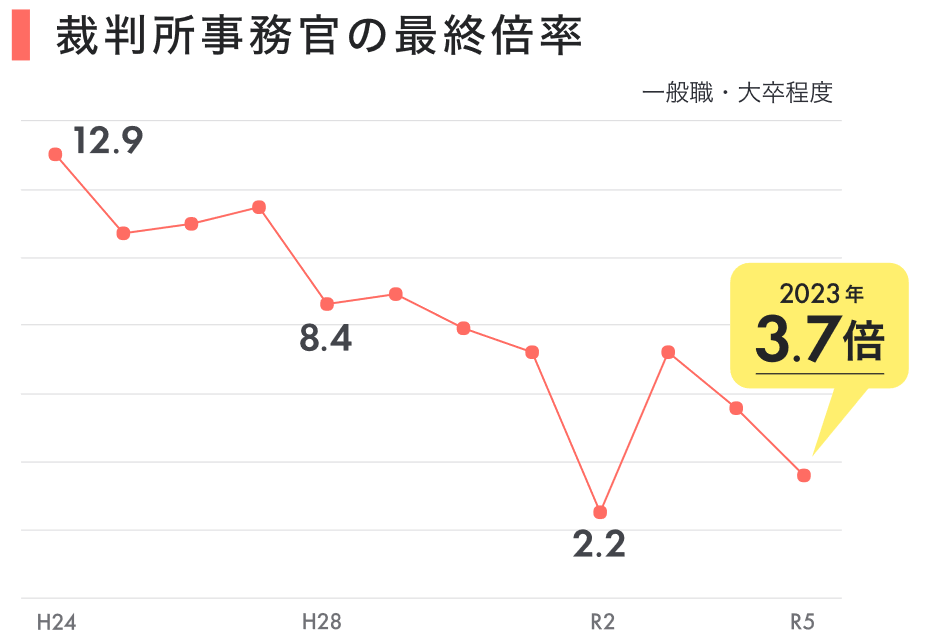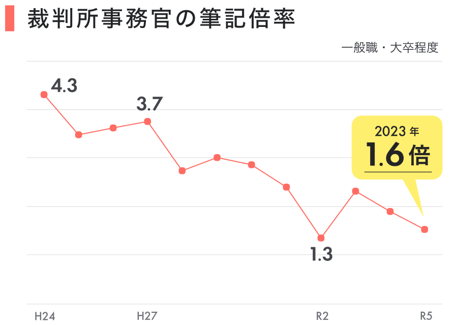 裁判所事務官の「筆記倍率」と「最終倍率」は近年減少傾向にあり、令和5年では、筆記倍率は「1.6倍」であり、最終倍率は「3.7倍」となりました。
