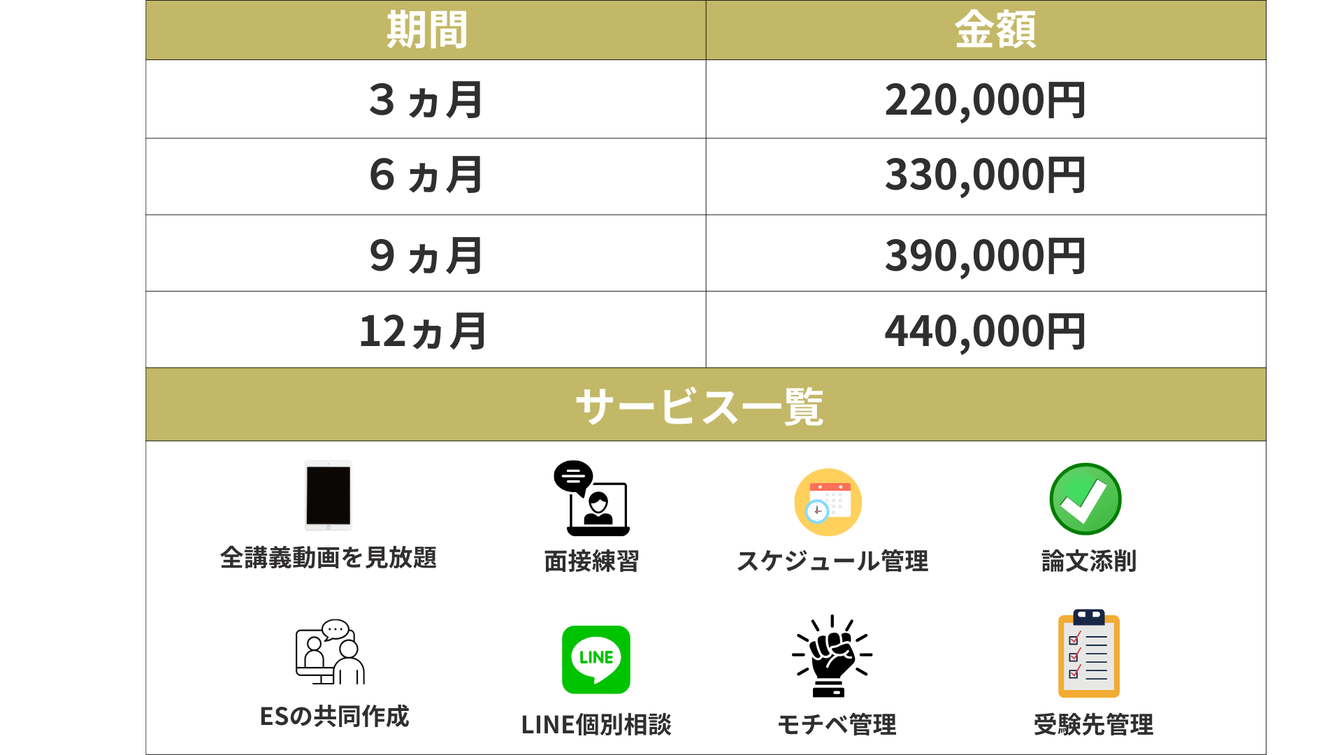 Q.講座を分割で購入することはできますか? はい。 マンツーマン個別指導やパック系講座などの一部は分割で購入することができます。分割購入の対象か確認したい場合はLINE公式にてご相談ください。