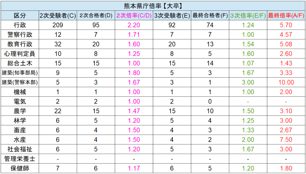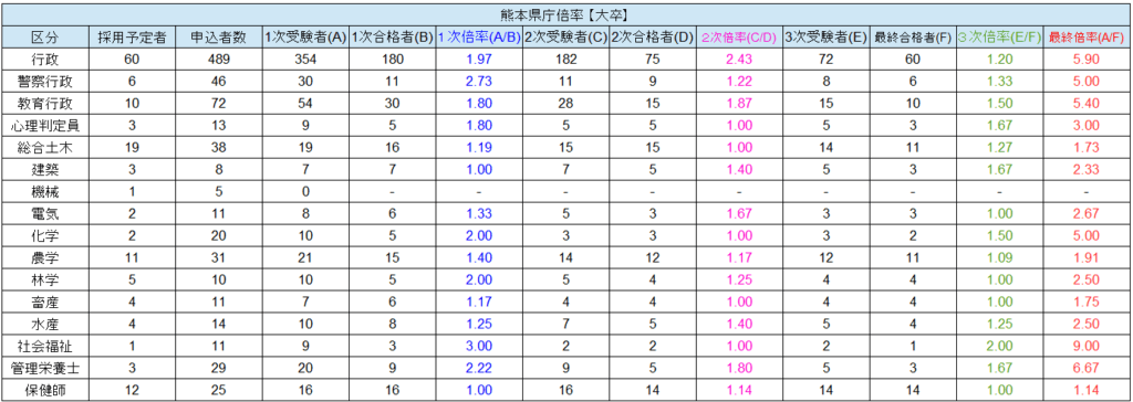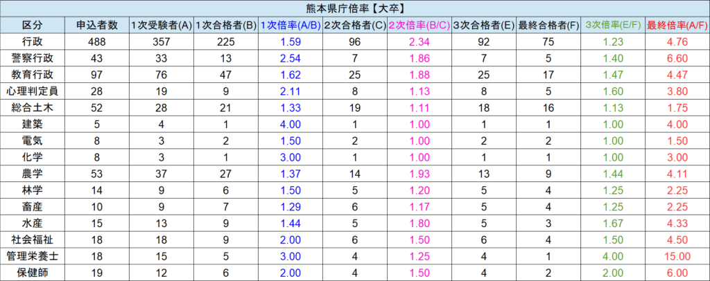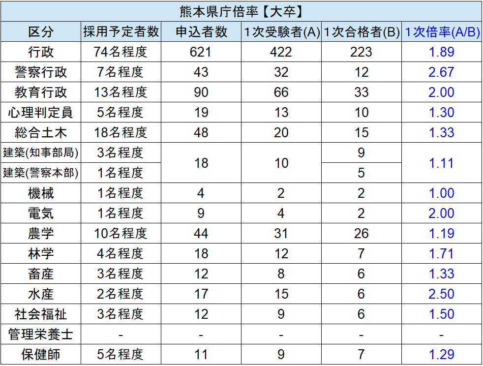 熊本県庁の全体の試験倍率は4~6倍前後で推移しています。