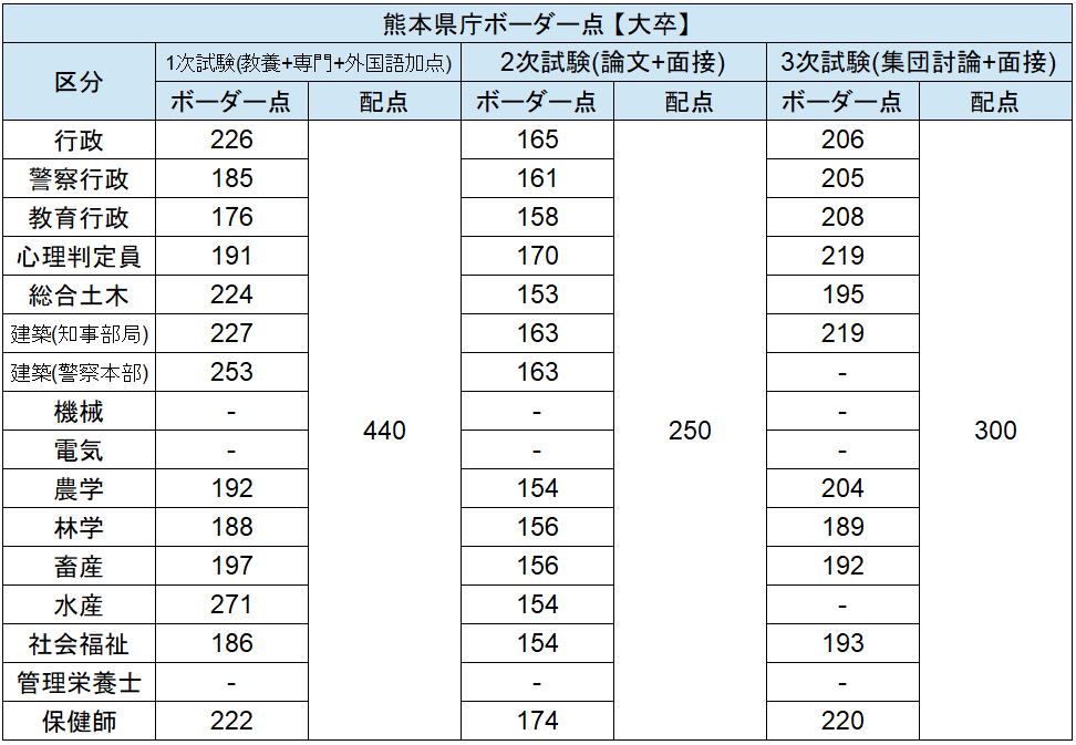 熊本県庁は1次2次3次のボーダー点をそれぞれ公表しています。