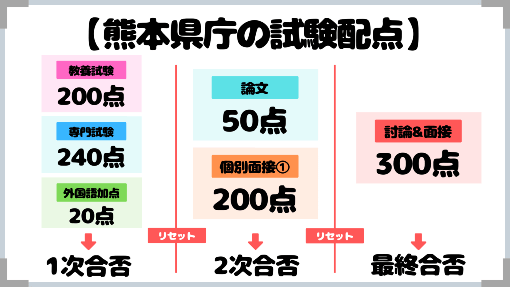 (論文や面接も合格基準点があります。例えば論文だと50点満点中20点以下で一発アウト。)