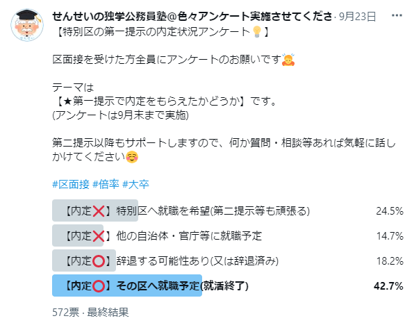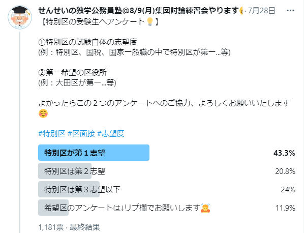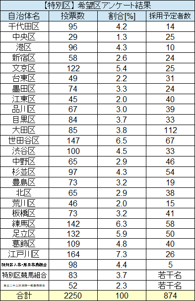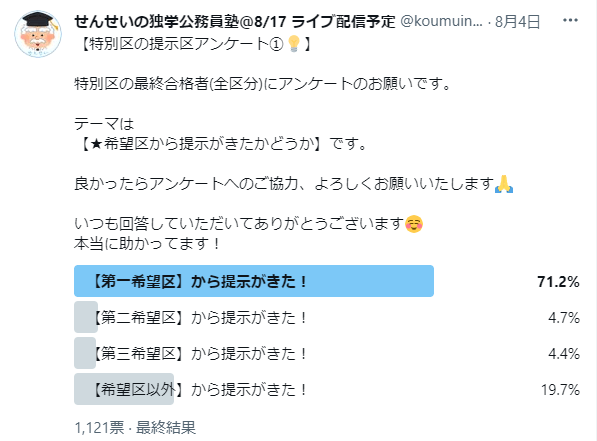 こちらは最終合格者1121名を対象とした【特別区の提示区アンケート】の結果です。