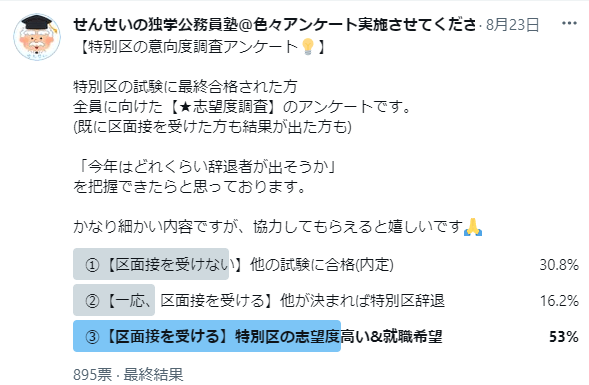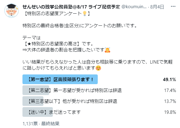 まぁ辞退者の割合を明確に出すのは難しいので、特別区の受験生を対象に【志望度の強さ】のアンケートを取りました。
