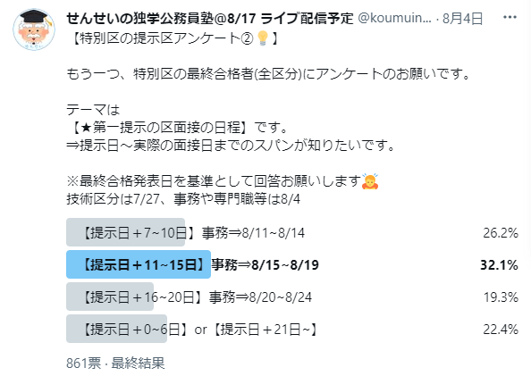こちらは最終合格者861名を対象とした【区面接の日程】に関するアンケートの結果です。