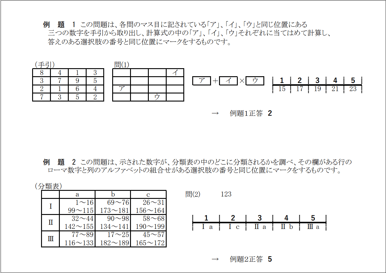 こちらが「課題対応能力試験」の例題です。「速く正確に課題を解く能力についての、多肢選択式(5択)マークシート試験」ということで、事務処理能力試験のような問題が出題されます。