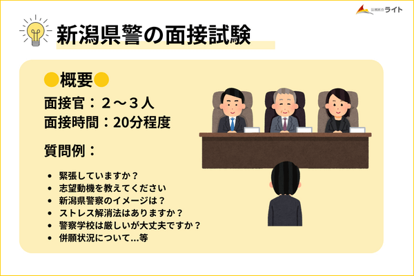 新潟県警の面接試験は、面接官が2〜3人、面接時間が20分程度となっており、面接官からの質問に答えていく試験です。