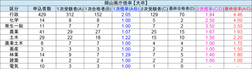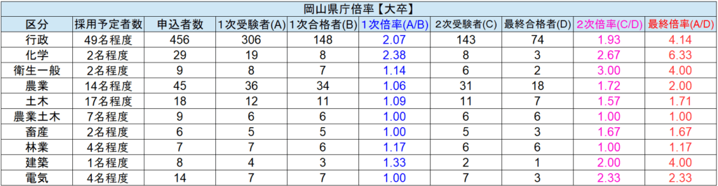 岡山県庁(行政)の筆記の倍率は近年2倍前後!