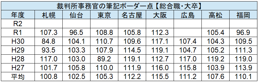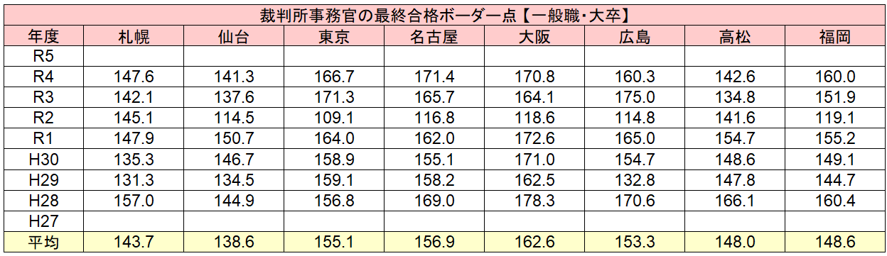 ここ5年の裁判所事務官の大卒ボーダー素点の平均値はコレです。