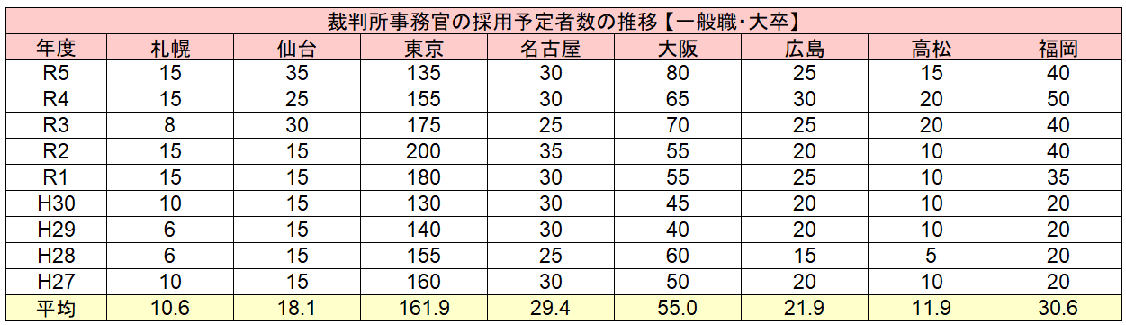 裁判所事務官の大卒・一般職における、採用予定者数の推移です。