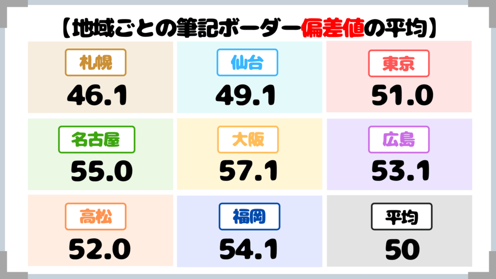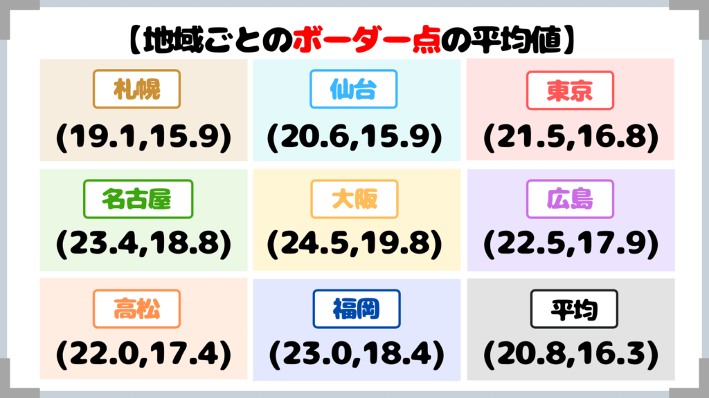 倍率や面接、論文や記述の評価について紹介していきたいなとは思うのですが、その前に『過去の筆記合格点の確定値』を地区ごとにまとめて紹介したいと思います。