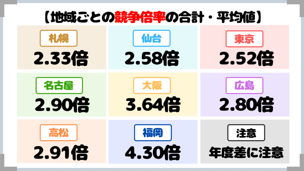 近年の各地区ごとの筆記倍率の合計・平均値はこんな感じです!
