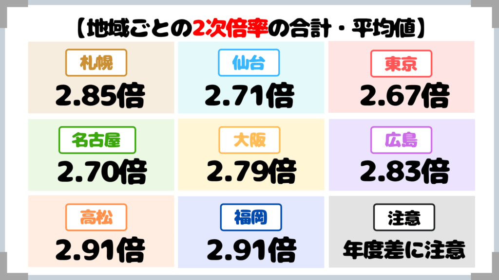 こちらの表は平均値なので、年度ごとの倍率の違いには注意が必要ですが、まぁだいたい3倍弱なんだな~と思っていただければと思います。