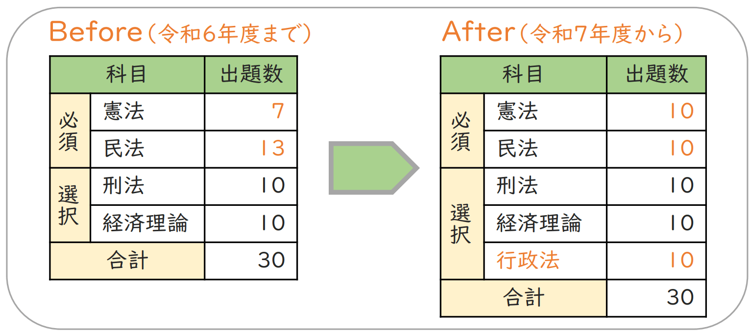 裁判所事務官の専門択一試験は、これまで「刑法10問」「経済理論10問」からどちらか1科目を選んで解答する方式でしたが、2025年度からは「行政法10問」も追加されます。