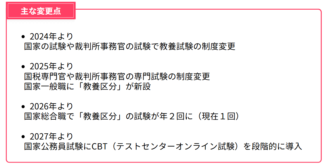 近年は、特に国家一般職や国税専門官、また裁判所事務官など、国家系の試験の「試験制度」が大幅に「変更」されています。
