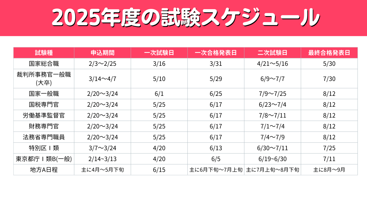 2025年度の公務員試験の日程を一覧で紹介しています。