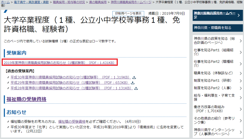 - 「〇〇県庁(市役所) 受験案内」と検索
