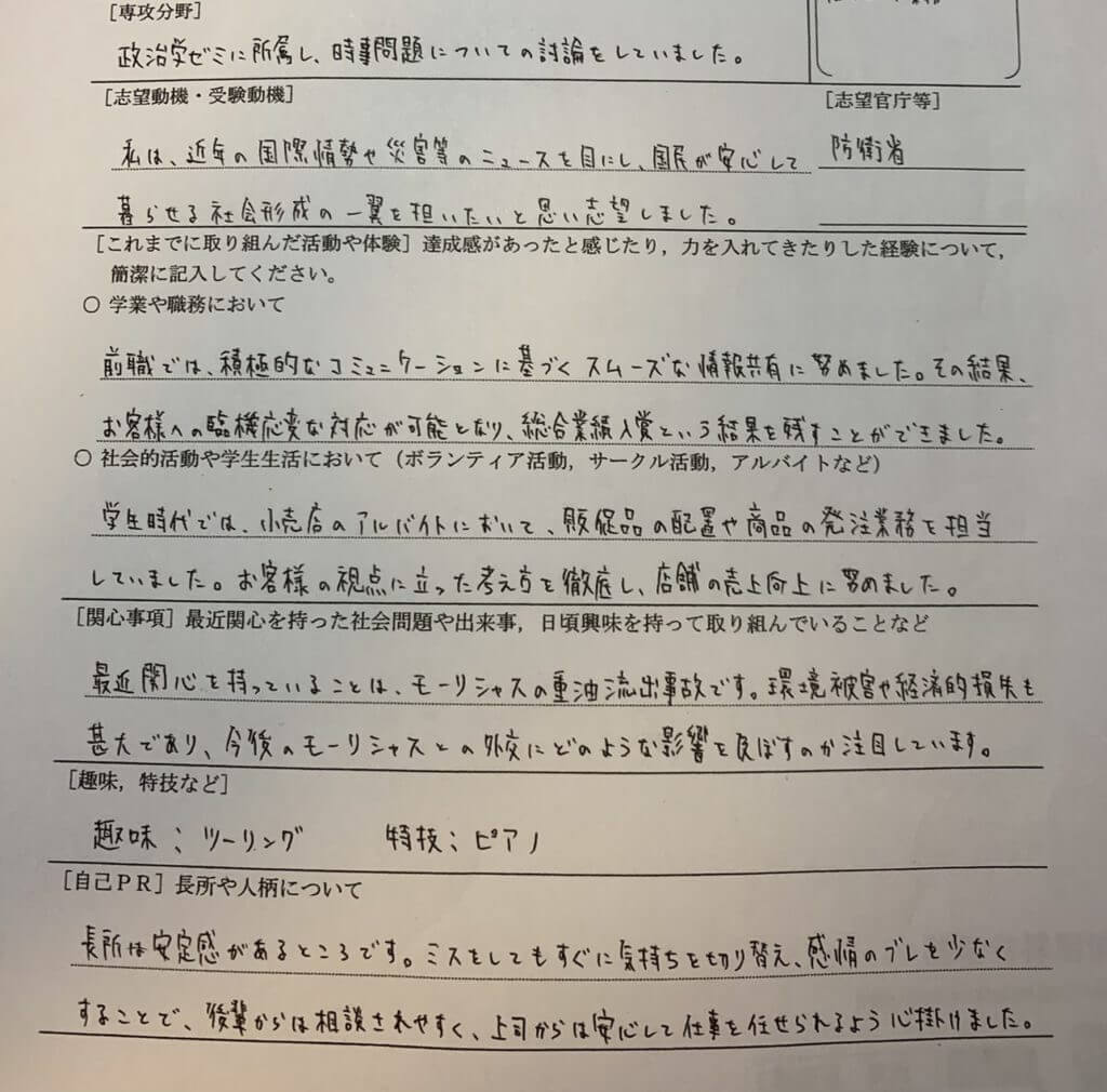 - 割としっかりとした面接といった感じでしたが、最後には「是非うちを(防衛省の中で)第一志望選んでほしい」と言われました。