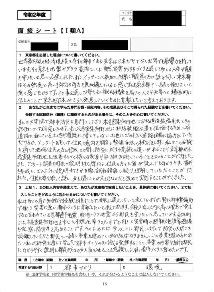 面接は先述した通り、都の施策を調べ自分なりの意見をまとめることと深掘り対策が重要だと思います。公務員試験に限らず面接では面接官にこの人と働きたいと思わせることが大切です。自分が職員だとしたらどういう人と働きたいかを考えると面接での振る舞いも自然と決まってくるかと思います。(自分なりの意見を持ち発信できる芯のある人物、何事にも挑戦しPDCAを回して前進できる人物など)