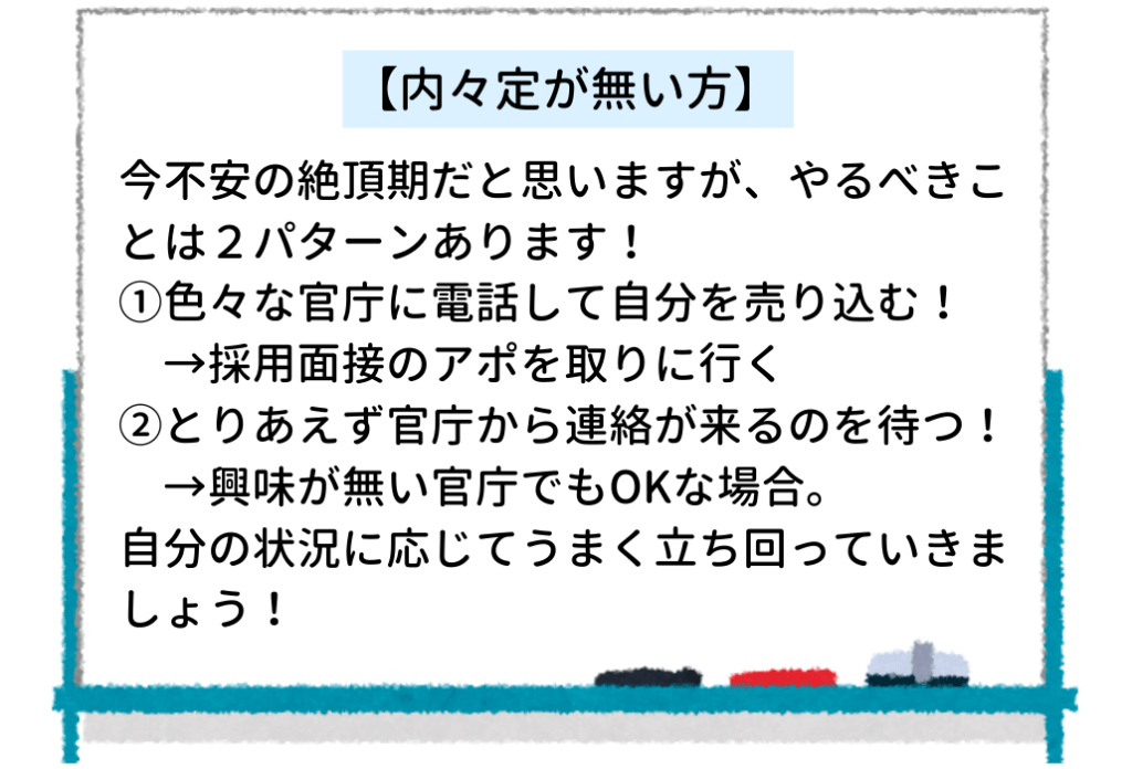 とりあえずその官庁に訪問することにしましたが、内々定はいただけませんでした。