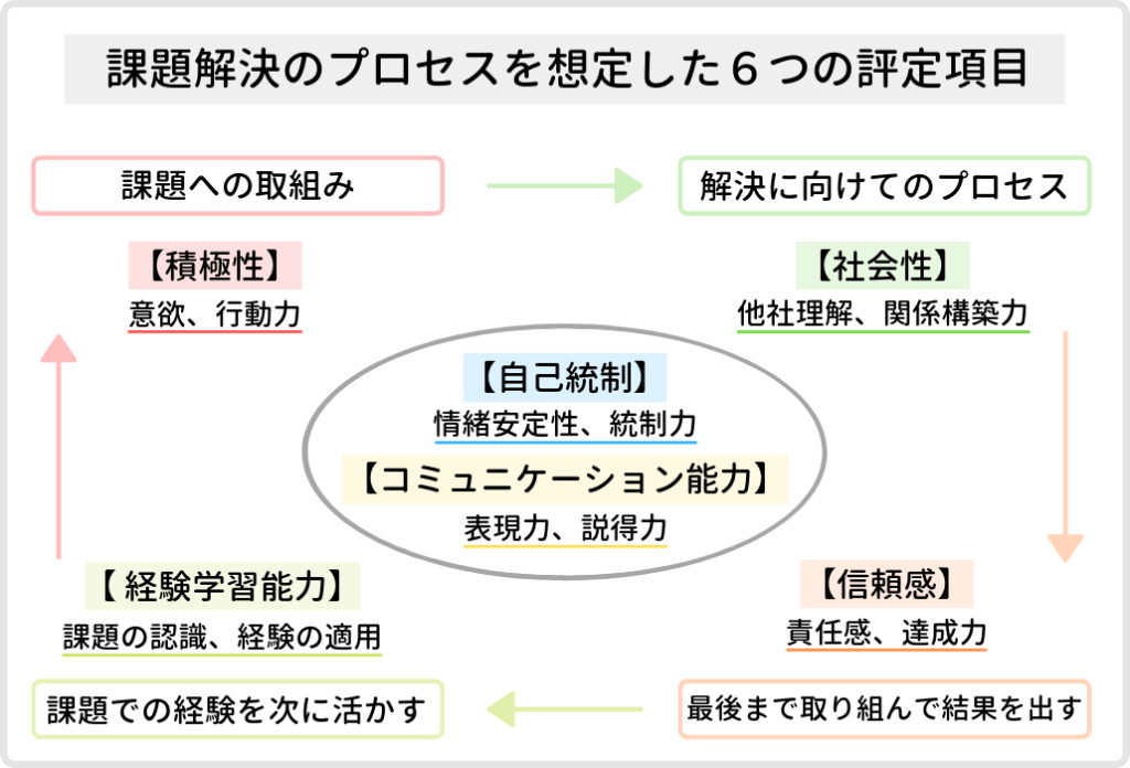 回答ポイントとして注意しなければいけないのは、『6つの評定項目』を意識するということですね!