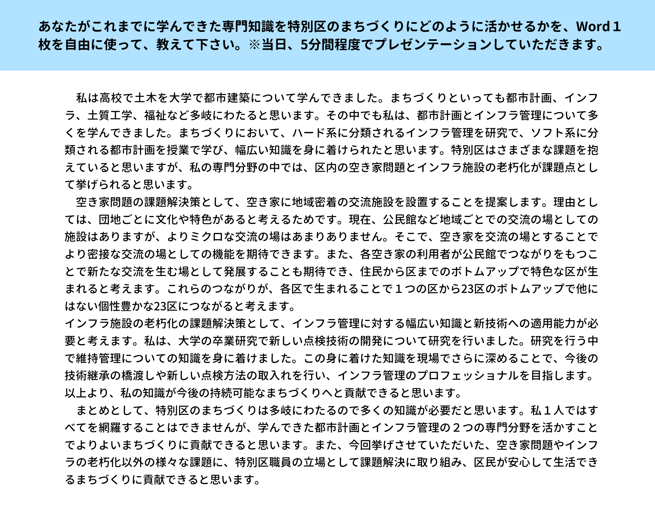 - あなたがこれまでに学んできた専門知識を特別区のまちづくりにどのように活かせるかを、ダウンロードした様式(Wordファイル:A4用紙1枚)を自由に使って、教えて下さい。