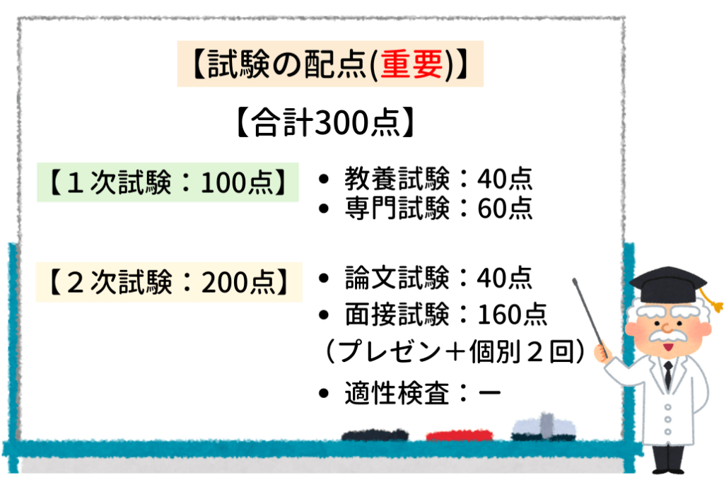 一次試験”と”二次試験”の「合計300点」で最終的な合否が決まるということですね!