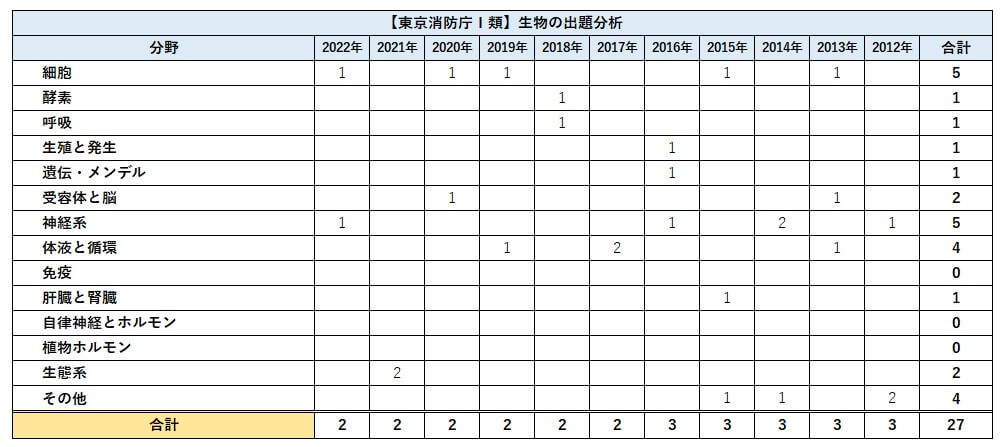 東京消防庁の教養試験の出題内訳は、上の表の通りです。