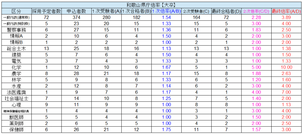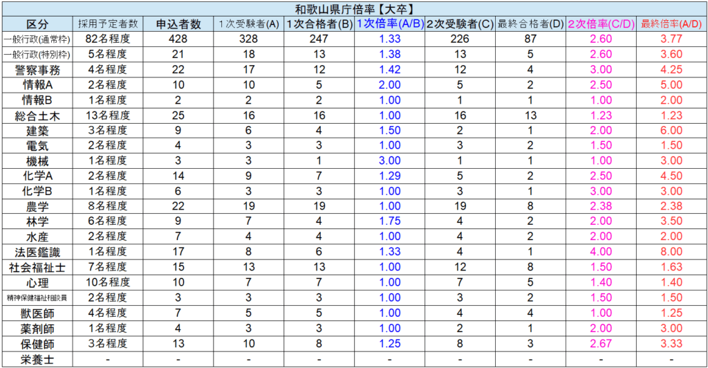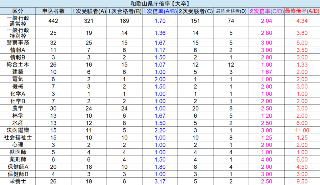 【和歌山県庁】令和1年度倍率一覧