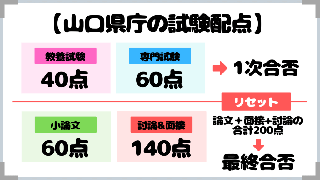 →2次試験からが本番!2次に進んだ人はレベルの高い人の集まりなので、ココで負けないように早め早めの対策を心がけて下さい。(山口県庁はリセット方式)