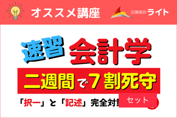 会計学は、国税専門官の志望度が高いなら安定して得点したいところです。そんな方に向けて、公務員のライトより『速習[会計学]2週間で7割死守講義』を発売しております✨ぜひご検討ください!