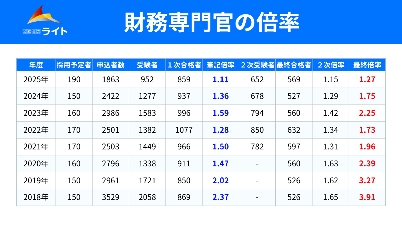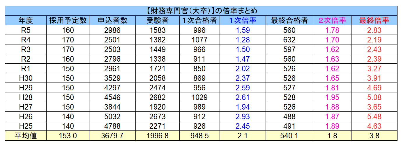 こちらが財務専門官のH25~R5年度までの試験倍率一覧になります。