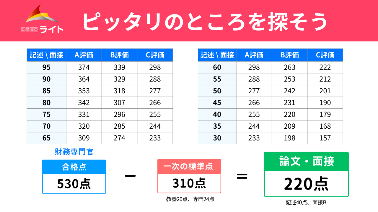 そして、右側の”差”というのは、筆記ボーダーぎりぎりの人が最終合格するために必要な『専門記述+面接』の点数(評価)を示したものです。【財務専門官】面接と専門記述のボーダーについて