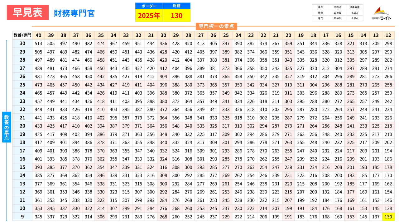 平均点を教養23、専門24点くらいに設定してみて下さい。③自分の素点との差を計算