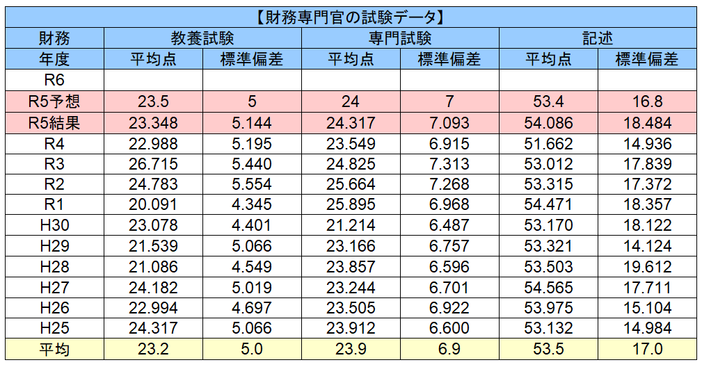 こちらが財務専門官のH25~R5年度の筆記試験データです。