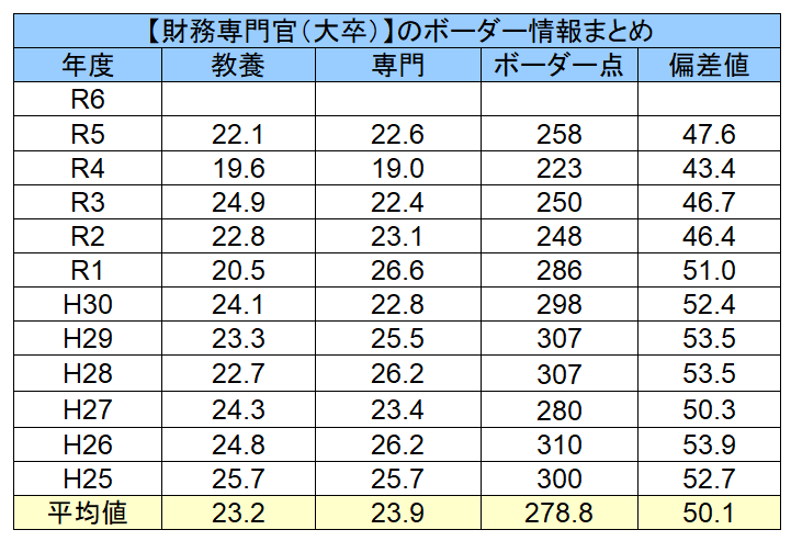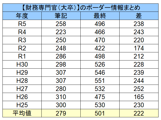 こちらがH25~R5年度までの財務専門官の筆記ボーダー点をまとめた表です。