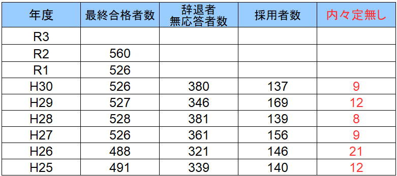 筆記試験が大体2.3倍前後、2次試験の倍率が大体1.8倍前後で推移しています。