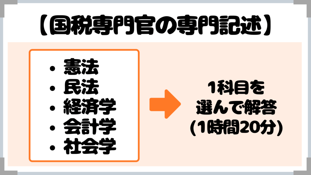国税専門官の専門記述は「憲法」「民法」「経済学」「会計学」「社会学」の5科目の中から、1題を選んで解答するタイプで、時間は1時間20分となっています。