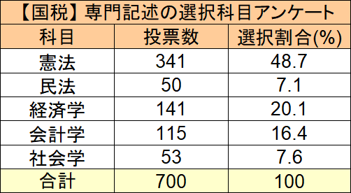 国税専門官の受験生や合格者を対象に、「★専門記述で何を選ぶか(選んだか)」のアンケートを実施したところ、700名の方にご回答いただけました。