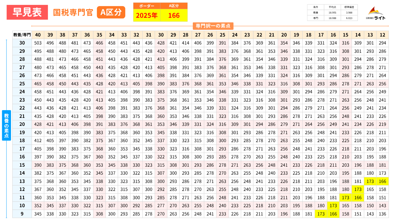 教養は平均-1問、専門択一は平均+9問ということになります。