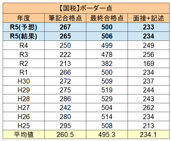 次は、国税専門官の試験難易度の考察ということで、【筆記ボーダー点】について紹介していきます!