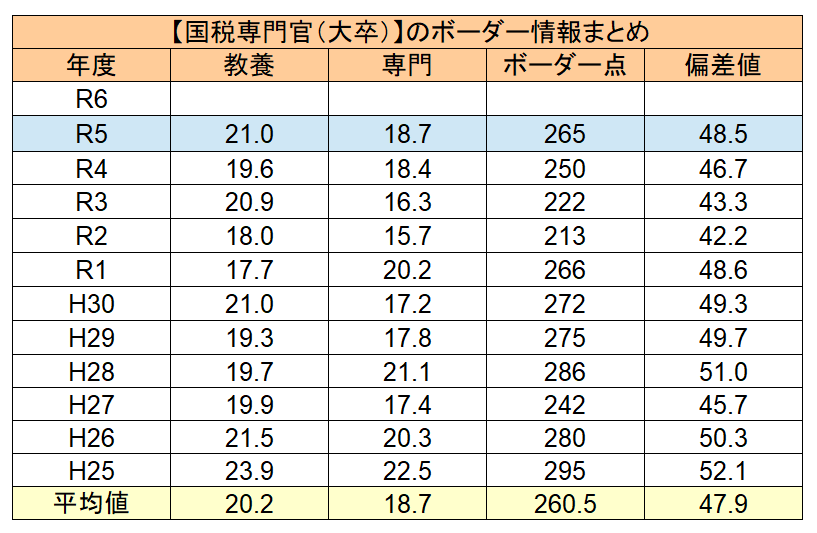 こちらがH25~R7年度までの国税専門官の筆記ボーダー点をまとめた表です。