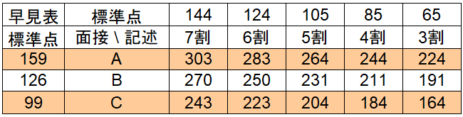 仮に筆記が13,12で166点だったとしても、記述5.5割、面接C評価で合格することができます。
