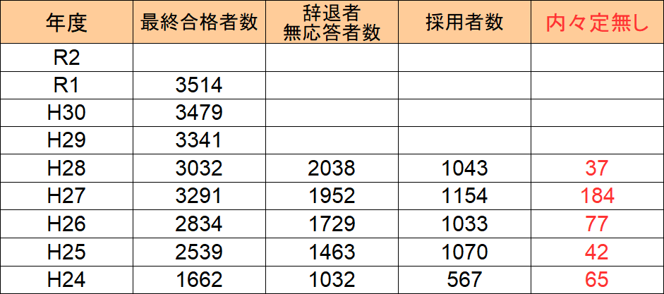 というのも例えばH28年、こちらは3000人程度が合格していますが、受験生の辞退率はかなり高かったと思います。(地方上級と併願という方も多い)