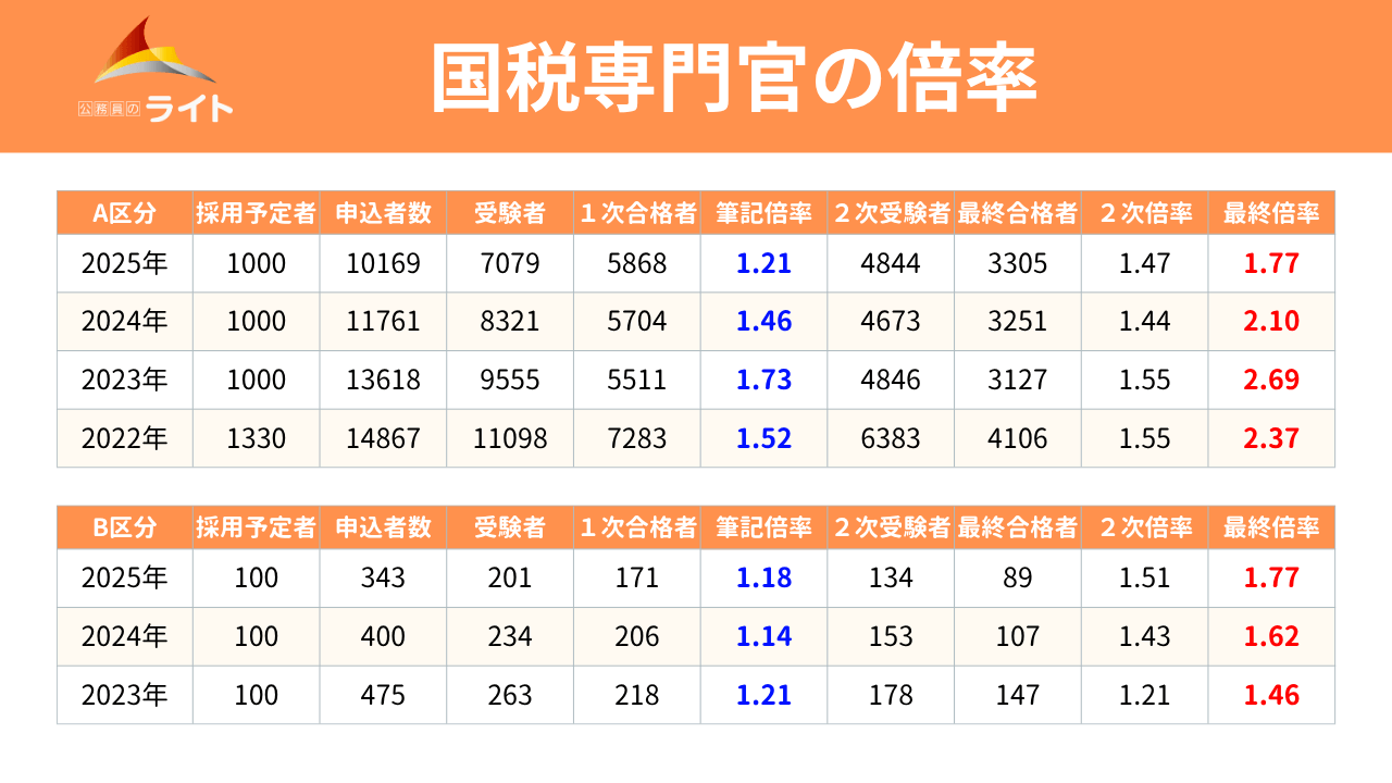 そして、国税専門官は面接の重要度が高いということもあって、2次試験倍率は1.8倍前後で推移しています。