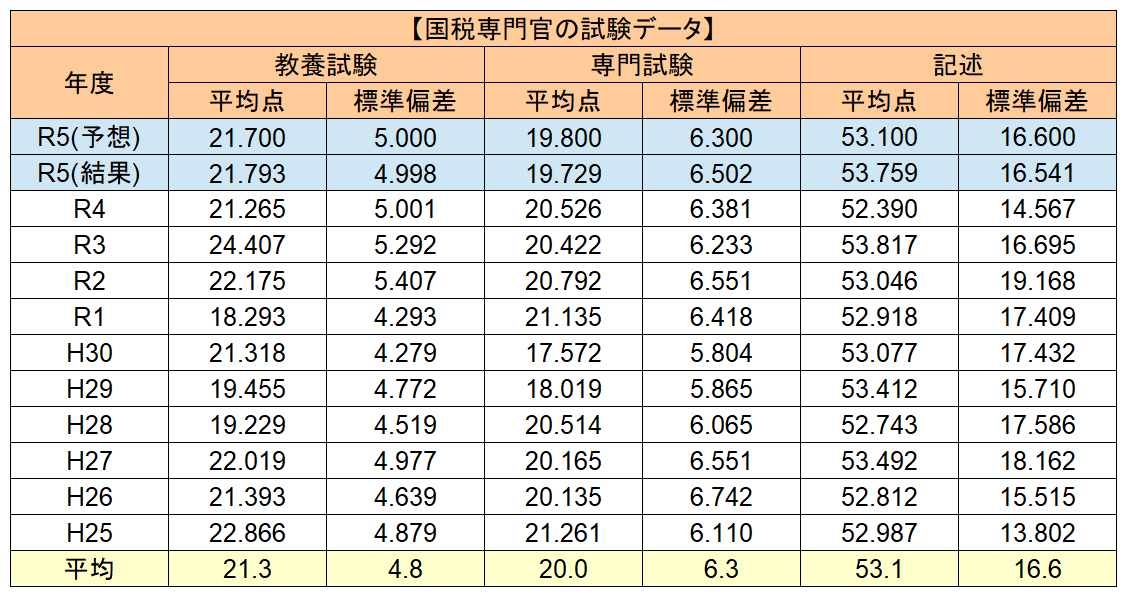 こちらが国税専門官のH25~最新年度の筆記試験データです。
