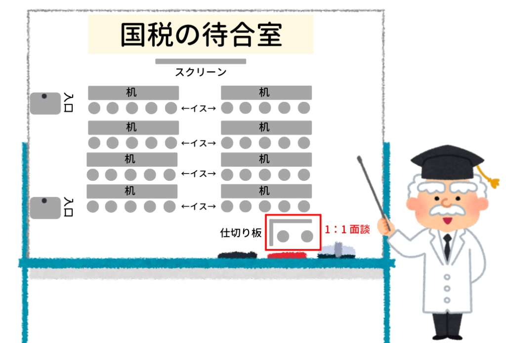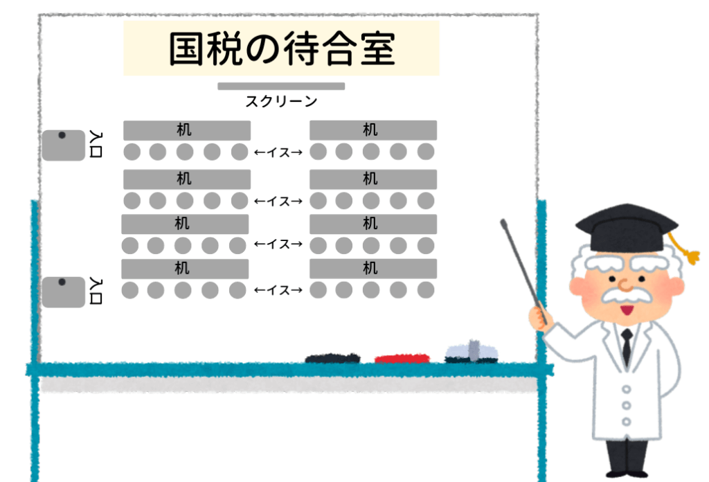 予約した日・時間に国税局に伺うと、まずは待合室で待たされます。